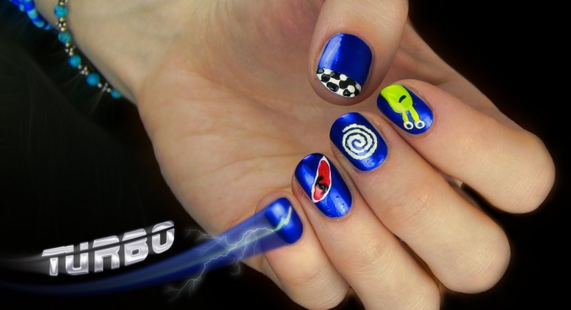 Turbo nail art is a nail design inspired by the Turbo movie. I am so excited about the Turbo cartoon that I decided to incorporate the racing snail theme on my finger nails. I think the Turbo Nail design came out really cute and pretty and many times an interesting nail design can be the best accessory to your overall look. First, I painted nails with a darker rich blue color that will make a great contrast with the cartoon nail art that I will draw on top. On my thumb, I decided to paint a finish line, since Turbo is a racing snail and he wants to win the race. I painted a thick white stripe and then a thinner black stripe on top. Then I used the dotting tool to make black dots to get the first little nail art — a finish line. On my index finger I drew Turbo. Since we want our snail nail art to really pop I first drew it with white. Then I used a bright yellow so that Turbo shines on the dark blue background. I think Turbo came out really pretty and cute. For my third nail design I decided to paint Turbo’s shell on my middle finger. To achieve this, I took a dotting tool and make a spiral out of tiny little nail polish dots. On my ring finger I’ve created a sporty red spoiler nail design and on top I wrote a number 5, since this is Turbo’s number. Finally, I created a lightning on my pinky finger using white and light blue color. I decided for the lightning nail art, since when Turbo is racing towards the finish line, he is fast as a lightning! The Turbo cartoon nail art is now complete!